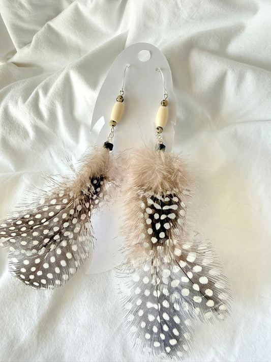 Bone Bead w/Pheasant Feathers - Indigenous Handmade Earrings
