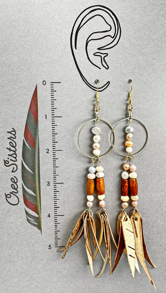 Indigenous Handcrafted Earrings - Birch Bark w/ Freshwater Pearls and Bone Beads