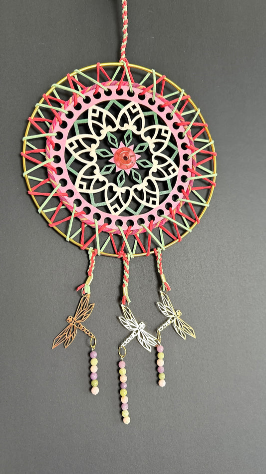 Hand painted Wooden Dreamcatcher w/ Lepidolite, Jade, Powder Opal - 'Dragonfly' (XL)