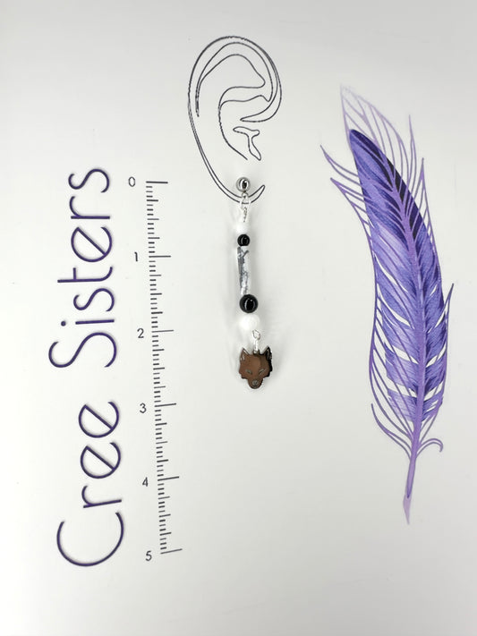 Boucles d'oreilles indigènes faites à la main - Howlite, jaspe noir, coquillage blanc, quartzite et « loup »